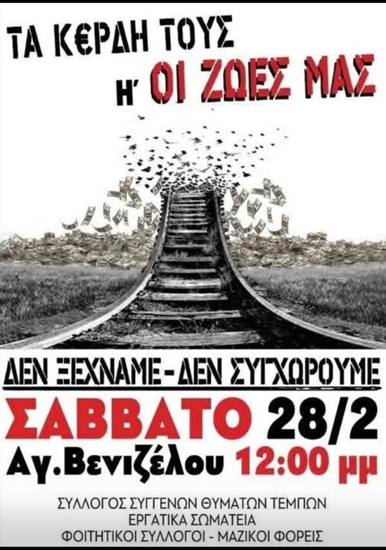 Ο Σύλλογος Υπαλλήλων ΥΠΠΟ Βορείου Ελλάδος συμμετέχει στην 24ωρη απεργία που κήρυξε η ΑΔΕΔΥ για όλους τους εργαζομένους που εργάζονται το Σάββατο 28 Φεβρουαρίου 2026, μέρα που συμπληρώνονται 3 χρόνια από το έγκλημα στα Τέμπη, που στοίχισε τη ζωή σε 57 συνανθρώπους μας και συγκλόνισε ολόκληρο το λαό.